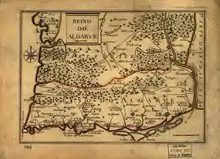 Silves (Arabic Shilb or Xelb) lies on the Arade some 8 miles (13 km) upriver from the coast. It is sited on a hill 200 feet (61 m) high. The river was crossed at that point by a bridge.[8] The city's population in 1189 was 15,800, according to the Narratio.[9] It came under indirect Almohad rule in 1146, when it was captured from the Almoravids and placed under the rule of Ibn Qasī, leader of the local Murīdūn sect. It came under direct Almohad rule in 1157.[10] It was the capital of the province of al-Gharb.[11] Its governor in 1189 was ʿĪsā ibn Abī Ḥafṣ ibn ʿĀlī.[12] According to Ibn ʿIdhārī, he was "very experienced in the defence of the frontiers."[13]