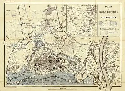 On 11 August, Baden's force put Strasbourg under observation. They occupied the nearby town of Schiltigheim, fortified it, and captured the Strasbourg suburb of Königshofen.[5] Werder understood the value of capturing the city, and ruled out a lengthy siege of starvation. He instead decided on a quicker action, bombarding the fortifications and the civilian population into submission. The first shells fell on the city on 14 August.[9]