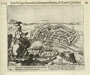 The siege of Venlo of 1586, also known as the Capture of Venlo, was a Spanish victory that took place on June 28, 1586, at the city of Venlo, in the southeastern of Low Countries, near the German border (present-day Province of Limburg, the Netherlands), between the Spanish forces commanded by Governor-General Don Alexander Farnese, Prince of Parma (Spanish: Alejandro Farnesio), and the Dutch garrison of Venlo, supported by relief troops under Maarten Schenck van Nydeggen and Sir Roger Williams, during the Eighty Years' War and the Anglo-Spanish War (1585–1604).[1][2] After two failed attempts to relieve the city, the siege ended on June 28, 1586, with the capitulation and the withdrawal of the Dutch garrison.[3][4][5]