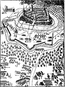 Leslie then decided to further increase the pressure by ordering two infantry regiments to close off all approaches, encircling the town completely. The attacking army soon received news of Ottoman reinforcements going their way from Slatina, in order to lift the siege. Upon learning this, Leslie ordered general Trautmansdorf to take his army and intercept the incoming reinforcements. Trautmansdorf, therefore took his men on a forced march throughout the night and managed to surprise the relief force by successfully attacking them using his cavalry and infantry. In his surprise attack, Trautmansdorf's contingent took out large number of Turks, while also capturing at least 200 alive.[3] The captured Turk prisoners were then marched back to Virovitica and demonstrated before town defenders, thus letting them know they will receive no help. The town garrison, upon seeing captured Turks of the relief party, while also receiving permission to leave town unharmed, decided to surrender to general Leslie on 25 July 1684.[4][3]