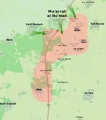 On 14 December, approximately 3,000 jihadist rebels[1] (mainly al-Nusra and Ahrar ash-Sham)[21] launched an offensive on the two bases and captured seven checkpoints on the first day.[4] Early the next morning, the al-Nusra Front, supported by Jund al-Aqsa and other Islamic fighters, captured the Wadi Deif base[22] and three checkpoints in addition to two tanks.[5] According to the SOHR, al-Nusra used U.S.-made BGM-71 TOW missiles, tanks and other heavy weaponry taken from the U.S. backed Syria Revolutionaries Front in the assault.[23][24] Later that day, rebels of the Ahrar ash-Sham[21] also captured the Hamadiyah base and the Tell Bansara and al-Naseh areas, forcing the Army to retreat from Hamadiyah to the villages of Basidah and Ma'ar Hattat.[25] A helicopter carrying Army officers took off from Hamadiyah base before it was captured.[26] At the end of the day, rebels captured Basidah after the Army retreated towards Ma'er Hattat.[27] Eventually, the Army also abandoned Ma'er Hattat and retreated towards the town of Murak through rebel-held territory. Some vehicles were reportedly hit by ambushes along the road, while dozens of soldiers managed to reach Murak in 10 vehicles. The Syrian Air Force conducted 42 airstrikes during the day.[7][28]