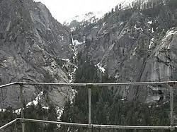 Following the rock slide, a portion of the trail approximately mid-way to Sierra Point is missing, although it is still possible to reach the point by scrambling over loose ground.[2] Although the trail is only 0.7 miles (1.1 km) long and about 1,000 feet (300 m) off the valley floor,[3] this hike should not be attempted by beginning hikers due to the difficulty of the missing portions of the trail. In fact, the National Park Service does not recommend that anyone take this trail. Despite this warning, many people still reach the point each year as it is easily accessible from the Vernal Fall trail in Happy Isles, and still has the original railing at the top.