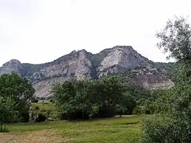Morphologically, the Foz de Arbayún and the cliff that opens on the Berdún channel are very relevant, as well as the abrupt end of the mountain range on the south side. This side of the range has two distinct parts, the lower one, with a 600 m slope, descends to the Aragón riverbed and is composed of magnas and the upper one, composed of sandy limestone, has a slope of 300 m.[6]