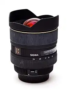 The Sigma 12-24mm f/4.5-5.6 EX DG HSM is a professional-level wide-angle zoom lens made by Sigma Corporation.[1] At launch it was the widest rectilinear lens available for full-frame 35mm SLR cameras, providing a field of view of 122 degrees. It has since been surpassed by the Canon EF 11-24mm f/4L zoom lens and the Irix 11mm f/4, a manual focus prime lens.[2] The Sigma 12-24 has low distortion even compared to less wide zooms like the Canon EF 16-35mm lens.[3]