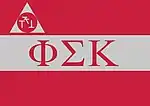 The official flag had been 7x5 feet in dimension, but in 2021 those specific dimensions were relaxed to allow flags of other sizes.[16] The description of the flag remains consistent: three horizontal bars of equal height. The bottom bar is red and symbolizes First and Second Degree members, the foundation of the fraternity. The middle bar is silver for Third and Fourth Degree members, indicative of the field of fraternal service. The Greek letters ΦΣΚ are located in the center of this bar. The top bar, also red, commemorates Fifth and Sixth Degree members, indicative of Grand Chapter recognition. The silver and red Tumbling T's logo inscribed in a triangle of silver is located at the left end of the upper bar.[11]