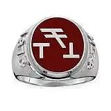 The official pin consists of the three Greek letters (ΦΣΚ). The letter Φ may be plain gold or crown set with fifteen whole pearls and is superimposed upon a rose engraved and rose finished chased gold Σ to the left and Κ to the right. As a mark of distinction, Council members may wear a ruby instead of a pearl as the center jewel and national presidents are presented with a badge set with diamonds instead of pearls, and with a ruby as the center jewel. Appointive officers may wear an emerald instead of a pearl as their center jewel. The pledge pin used to be a red button approximately 3/8 inch in diameter. That pin was surrounded by a silver band in which the original Three T characters of the society were inset in silver. After the adoption of the merger symbolism in 1987, the circle and Triple T's characters were circumscribed by a slightly larger triangle of silver.[11]