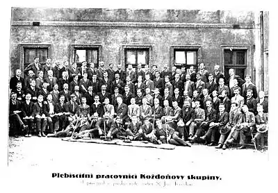 In this period the Szlonzakian movement had a broad base of support. The SPP had more than 10,000 members and the Union of Silesians had 52,000.[18] At this time, the Plebiscite Committee of the Silesian People's Party was founded in Karwina, along with 139 communal plebiscite committees in the counties of Bielsko (50 committees), Cieszyn (61 committees) and Fryštát (28 committees).[19] In the winter of 1920 in Fryštat, František Janku and Paweł Bajtek founded the Silesian Social-Democratic Party, formed from Silesian workers, who were mainly former members of the Polish Socialist Party and the Silesian People's Party from Wisła, Ustroń and Goleszów. Karol Smyczek, Kożdoń’s personal secretary, was important in the formation of this new party's local organizations. Taken together, the members and supporters of the Szlonzakian movement numbered about 100,000 in 1920.[20]