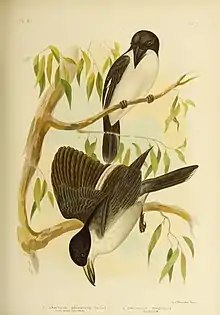 The silver-backed butcherbird looks similar to the Grey butcherbird, except its back is lighter and silvery.[4] This species is snappy and fearless, diving at humans and dogs near the nest. It may attack other birds like the spangled drongo or common koel.
