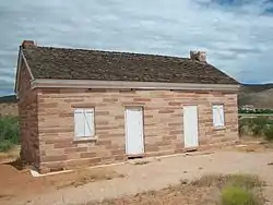 Although most of the residents of Silver Reef were not Mormon, they had good relations with residents of the nearby Mormon settlements.[36] A lot of the cotton and other agricultural items produced in the area were transported by wagon to Silver Reef. Many of the town's buildings were constructed by Mormon labor workers. Reverend Lawrence Scanlan was invited to say Mass in the St. George Tabernacle of the Church of Jesus Christ of Latter-day Saints before the Catholic church in Silver Reef was constructed.[37] To assist Scanlan, the Mormon choir learned Latin chants.[25] When politics were involved, however, these good relations were forgotten. Most Mormons were members of the People's Party, and most people in Silver Reef were members of the Liberal Party. As Silver Reef grew, the townspeople wanted to change the county seat of Washington County from St. George to Silver Reef. This alarmed the members of the People's Party, the main figures in the territorial legislature. The legislature moved the county line eastward in 1882; this maintained the People's Party majority in Washington County by transferring such Mormon farming communities as Grafton, Rockville, and Springdale from Kane County to Washington County.[25]