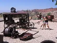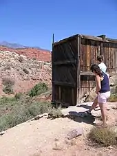 Geologists and other miners refused at first to believe the news that silver had been found in sandstone. When brought an actual sample from the area, the Smithsonian Institution called it an "interesting fake".[4] In 1875, news of the silver discovery reached the Walker brothers, well-known bankers from Salt Lake City. They hired William T. Barbee, who had previously staked mining claims in Ophir,[26] to stake claims on their behalf. He staked 21 claims and published an article on the claims in The Salt Lake Tribune. In the article, Barbee mentioned that the area had "an abundance of rich silver mines".[27] This set off a silver rush,[26] and by late 1875, Barbee had established a town called Bonanza City. Several businessmen then came into the area, inflating property values. Many miners and businessmen looking for inexpensive land set up a tent city north of Bonanza City and called it "Rockpile".[3] When the mines in nearby Pioche were closed in November 1875, many of the miners and business owners who had worked there came into the area of "Rockpile" in what is known as the "Pioche Silver Stampede",[28] and the name of the settlement was changed to Silver Reef. As construction of the St. George LDS Temple ended in mid-1877, labor opportunities for the workers became available in Silver Reef. Pine Valley Mills and Mount Trumbull in the Arizona Strip supplied most of the lumber used to construct the buildings. During its first year, Silver Reef did not have a smelter; as a result, the silver ore mined in Silver Reef was taken to Pioche and Salt Lake City for smelting.[26]