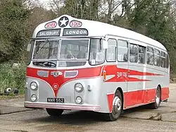 In 1939 Silver Star acquired its first double decker vehicles, with six second hand Leyland Titan TD1s being purchased from the Yorkshire Woollen District Transport Company. These were required for transport of construction workers to the military camp at Figsbury Barracks.[1] Soon after the start of World War II, several of the Silver Star vehicles were requisitioned by the War Department, only one of which was later returned to the company. This was countered by the arrival of other second hand vehicles, including several ex-Southdown vehicles acquired from Wilts & Dorset.[3] However, by the end of the war, much of the Silver Star fleet was in a run-down condition and needed updating.