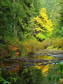 Until the mid-19th century, the Silverton area was a broad, open grassland with small stands of Oregon white oak, ponderosa pine and Douglas fir. Stands of Oregon white oak, red alder, big leaf maple, and black cottonwood lined streams and river banks. While these tree species are extant today, widespread farming in the Willamette Valley between 1850 and 1870 altered the land through the discontinuation of widespread seasonal burning in the valley plains previously employed by the Kalapuya people. Large stands of Douglas fir and western red cedar, mixed with Oregon white oak, remain in the Silverton area, especially on eastern ridge tops and on the slopes of the Waldo Hills to the south. Due to decades of intensive timber extraction, mature second- and third-growth trees comprise existing evergreen stands.[10][11]