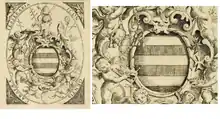 The arms on the title page of one of the Francesco Corbelletti's 1639 publications,[4] i. e. the Rome publisher of Petra Sancta, already represents a complete example of heraldic hatching. That means Corbelletti took over the heraldic hatching system already in the next year after the 1638 system of Petra Sancta appeared. If we consider the time needed to prepare the engravings and the approval by the censor,[upper-alpha 1] Corbelletti must have known the hatching system of Petra Sancta even before 1638.