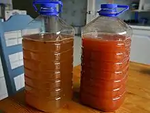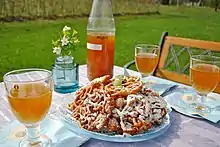 Sima is a Finnish fermented low-level alcoholic drink and soft drink. It is traditionally a form of mead, an alcoholic beverage produced by fermenting a solution of honey and water, although nowadays the honey is usually replaced with different kinds of sugar, mostly syrup, which makes it a sugar wine.[1] The drink also has a very low alcohol content due to limited fermentation. Sima is therefore a sweet sparkling beverage that is mainly seasonal and connected with the Finnish Vappu festival. It is usually spiced by adding both the flesh and rind of a lemon.
