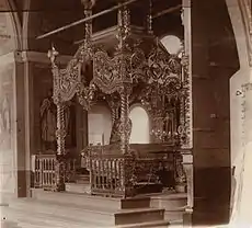 On 12 September 1704, the relics of Simeon were translated to the Nikolayevsky Monastery of Verkhoturye with the blessings of metropolitan Philotheus, and brought to the right-sided kliros of the monastery church. According to a legend, the translation was related to a cross procession, after lame Fool Cosmas prayed and wished to take rest.[5] In 1716, the church was burnt down, but the shrine with the relics was unaffected and in 1838 was placed to the side-altar of Simeon the God-Receiver and Anna the Prophetess, which was renamed in honour of Simeon of Verkhoturye in 1863. The burial place of Simeon in Merkushino, where a spring gushed, was also honoured. The wooden chapel above it was replaced by a new stone chapel in 1808.