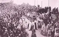After the October Revolution, the authority of Verkhoturye passed to the Bolsheviks. On 17 August 1918, at the request of the head of the Extraordinary Board of Inquiry, A. V. Saburov, the first public opening of the relics of Simeon took place. Archimandrit Xenophon (Medvedev), abbot of the Nikolayevsky Monastery, conciliated his parish about this sacrilege, and explained that the opening was limited to the removal of the shroud.[10][11] In September 1918, the town was taken over by Kolchak's army.