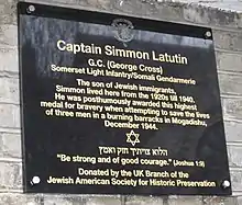 Captain Simmon Latutin GC (25 July 1916 – 30 December 1944) was a British Army officer who was posthumously awarded the George Cross, the highest British (and Commonwealth) award for bravery out of combat. He won his award for the gallantry he showed in rescuing two comrades, and attempting to save a boy, from a blazing ammunition store on 29 December 1944 in Mogadishu, Somaliland.[1]