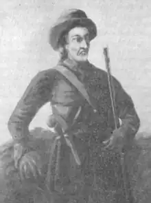 Simon Girty (November 14, 1741 – February 18, 1818)[lower-alpha 1] was an American-born frontiersman, soldier and interpreter from Harrisburg, Pennsylvania who served as a liaison between the British and their Indian allies during the American Revolutionary War. He was portrayed as a villain, and was also featured this way in 19th- and early 20th-century fiction from the United States. As children, Girty and his brothers were taken captive in Pennsylvania in a Seneca raid and adopted. He lived with the Seneca for seven years and became fully assimilated, preferring their culture. He was returned to his birth family but retained a sympathy for the Indians.