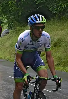 Yates along with his brother joined the Australian UCI World Tour team Orica–GreenEDGE in 2014.[17] He finished 12th overall in one of his first World Tour races, the Tour of the Basque Country. Yates suffered a broken collarbone on Stage 3 of the Tour of Turkey.[18] He recovered to take seventh overall and the young rider classification in the Tour of Slovenia in June. He was a surprise selection for the Orica–GreenEDGE team for the 2014 Tour de France, with only 5 days' notice, and was one of only 4 British riders to take to the Grand Départ startline in Leeds.[19] Yates featured in two breakaways during his Grand Tour debut, before being withdrawn by his team on the second rest day.[20]