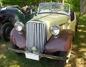The successful Roadster re-appeared following the war, in 1946, with these modifications: non-lubricated rubber shackle bushes, improved seating accommodation provided by moving the engine forward and an improved lid at the rear of the body providing a flat platform for luggage.[7] These changes seem to have improved the handling.[5] Better engine mounts and other isolations were introduced, providing a smoother ride and lessening maintenance. Cars began to filter out to the dealers in September 1946.[8] Nearly all post war production was exported the car being popular with the Elite in India and featured in the collections of a few Maharaja's.