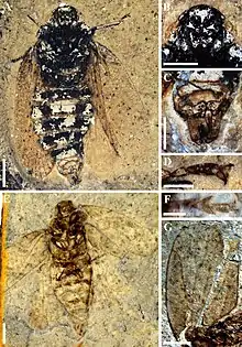- ↑ Chen, Jun; Wang, Bo; Zheng, Yan; Jarzembowski, Ed; Jiang, Tian; Wang, Xiaoli; Zheng, Xiaoting; Zhang, Haichun (2019-12-17). "Female-biased froghoppers (Hemiptera, Cercopoidea) from the Mesozoic of China and phylogenetic reconstruction of early Cercopoidea". Journal of Systematic Palaeontology. 17 (24): 2091–2103. doi:10.1080/14772019.2019.1587526. ISSN 1477-2019. S2CID 146114370.