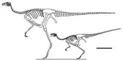 The herbivory of this genus is supported by the rare presence of gastroliths, as such stones were found forming conspicuous masses in the stomach areas of the fossil skeletons.[7] This species was gregarious, which is corroborated by the arrangement of the fossil remains in a small bonebed with the juvenile individuals being approximately of the same age. This is furthermore supported by the increase of running ability as the animal progressed in its ontogeny, thus shown in the more cursorial proportions of the adults which possess relatively longer lower legs. It was assumed by the describers that adults protected themselves and their juveniles from predators by forming familial groups; in 2008 however a study concluded that the all juvenile herds suggest that immature individuals were left to fend for themselves in juvenile groups while adults preoccupied themselves with nesting or brooding.[2][3]