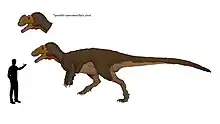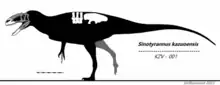 Sinotyrannus (meaning "Chinese tyrant") is a genus of large basal tyrannosauroid[1] dinosaur, known from a single incomplete fossil specimen including a partial skull, from the Early Cretaceous Jiufotang Formation of Liaoning, China. Specifically, it is a member of the Proceratosauridae, a family that originated in the Jurassic whose members are known from Europe and Asia. Though it is not significantly younger than primitive tyrannosauroids such as Dilong, it is similar in size to later forms such as Tyrannosaurus. It was much larger than contemporary tyrannosauroids, reaching a total estimated length of 9–10 m (30–33 ft), and was the largest known theropod from the Jiufotang Formation. The type species, S. kazuoensis, was described by Ji et al. in 2009.[2]
