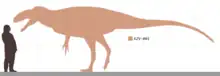 Sinotyrannus was a large tyrannosaur, measuring approximately 9–10 metres (30–33 ft) long and weighing 2.5 metric tons (2.8 short tons).[2][3] It was among the largest basal tyrannosauroids known, repudiating the previously presumed trend that tyrannosauroids gradually increased in size throughout the Cretaceous period from small basal forms like Dilong to advanced apex predators such as Tyrannosaurus. The holotype, KZV-001, consists of a disarticulated partial skeleton including the front portion of the skull, three dorsal vertebrae, incomplete ilia, three articulated manual phalanges (including an ungual), and other fragmentary bones.[2]