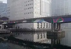 Tantra's palette of muted pinks and blues was complemented by a lighting scheme by Lighting Design International. LED projectors under the bridge washed soft coloured light from end to end, which adapted to echo the transitions of sky from day to night.[28] The painting required 5,000 litres of paint and over 3 km of specialist masking tape to achieve the clean, precise lines that Tantra is known for.[29] As part of the project, Tantra recorded a 24-hour time lapse sequence that showed the sunset and sunrise over the bridge.[28] It is part of Canary Wharf Group's Permanent Collection, alongside artists such as Lynn Chadwick, Bruce McLean, and Catherine Yass.