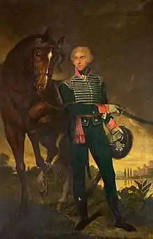 Leicester acted also as lieutenant-colonel of the Cheshire militia, and after thirteen years' service was appointed colonel of a regiment of cavalry raised for home defence. During the Napoleonic Wars he raised the regiment eventually called the Cheshire Yeomanry. In 1817, it took part in dispersing the Blanketeers in Lancashire.[1]