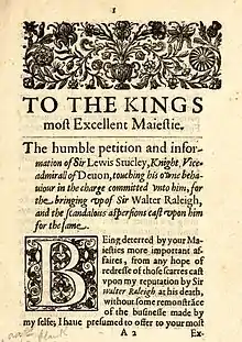 There were in fact two published documents in which Stucley put his side of the argument, an Apology, and the Petition of 26 November. There was also an official defence of the king's proceedings, the Declaration, written by Francis Bacon, possibly with Henry Yelverton and Robert Naunton. The Apology having failed, Stucley issued the Petition in effect asking for official backing; which was published in the Declaration of 27 November, the printers having been up all night.[18][19][20]