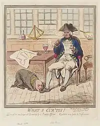 Curtis's subsequent actions increased the distrust felt by his fellow officers. While Curtis was granted a baronetcy[8] for his role in the action, another captain, Anthony Molloy, faced a court martial and national disgrace for what was considered to be his failure to engage the enemy during the battle.[6] Curtis stood as prosecutor in the case, and Molloy was subsequently dismissed from his ship and effectively from the service as the result of Curtis's prosecution. Cuthbert Collingwood, one of the captains overlooked by the despatch, subsequently described Curtis as "an artful, sneeking creature, whose fawning insinuating manners creeps into the confidence of whoever he attacks and whose rapacity wou'd grasp all honours and all profits that come within his view".[2]