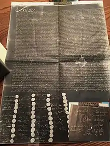 The expedition cost the colony £50,000 to mount, for which it issued paper currency, a first in the English colonies.[68] Many of the expedition's participants and creditors were unhappy at being paid this way, and Phips generously purchased some of the depreciated paper with hard currency, incurring financial losses in the process. At this same time, Governor Meneval petitioned for the return of minor valuables (silverware and other small items) that Phips had taken.[52] Phips was outraged when the General Council heard Meneval's case. He returned to England in February 1691 to seek support for another expedition against Quebec.[16]