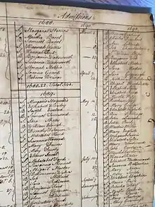 Both events are not mutually exclusive. Cotton Mather places the baptism the next day, March 23. The general court in which Cotton Mather played an active role may have made Phips free with the understanding that Cotton Mather would add him to the rolls of the North Church. Records of the North Church show Phips' name added to admissions. (Curiously, a "B" for "brother" is withheld as prefix to his name, unlike all others. See image.) Another book, mostly recording infant baptisms, lists Phips as "Admitted and Baptized." Phip's wife's name does not seems not to appear in the records at all. The admission and baptism of an adult was generally a somewhat drawn-out process over some weeks.[56] There seems to be no surviving record of Phips "coming to the table" to partake in the Lord's Supper, as only church members were invited to do.
