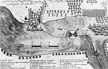 Because of contrary winds and the difficulty in navigating the Saint Lawrence, the expedition took eight weeks to reach Quebec.[66] The late arrival (wintry conditions were already setting in on the river) and the long voyage meant that it would be impossible to conduct a lengthy siege. Phips sent a message into the citadel demanding its surrender. Governor General Louis de Buade de Frontenac declared that his only response would be from "the mouths of my cannons".[65] Phips then held a war council, which decided to make a combined land assault and naval bombardment.[66] Both failed. The landing force, 1,200 men led by Major John Walley, were unable to cross the well-defended Saint-Charles River, and the naval bombardment failed because the New Englanders' guns were unable to reach the high battlements of the city, and they furthermore soon ran out of ammunition. The fighting, according to Phips, cost the expedition 30 deaths and one field cannon, as well as numerous wounded; disease and disaster took an additional toll. Smallpox ravaged the troops, and two transports were lost to accidents; another 200 men were lost to these causes.[67]