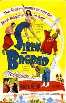 Siren of Bagdad is a 1953 Technicolor fantasy adventure film produced by Sam Katzman and directed by Richard Quine set in the medieval Iraq. It stars Paul Henreid as a travelling Master magician who seeks to recover his troop of beautiful dancing girls who are to be sold into slavery. Patricia Medina portrays his love interest who seeks to overthrow the corrupt Grand Vizier with the magician's help.[1] Hans Conried plays the sidekick to Quine's magician, who is transformed into a beautiful blonde woman who spies and distracts the Grand Vizier while retaining Conried's voice.