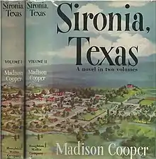 Sironia, Texas is a novel by American author Madison Cooper that describes life in the fictional town of Sironia, Texas, in the early 20th century. The book won the Houghton Mifflin Literary Award.[1] Sironia is widely thought to be a thinly disguised version of Cooper's hometown of Waco, Texas. The book contains over 1,700 pages, making it one of the longest novels in the English language.[2] Written over a period of 11 years,[1] it was published in 1952.[2] It sold 25,000 copies in its initial printing, but quickly faded from public view.[1] Cooper subtly satirized upper-class southerners throughout the book.[3]
