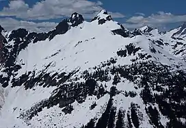 Sitting Bull Mountain is a 7,759-foot (2,365-metre) double summit mountain in the North Cascades of Washington state. The north summit is higher than the south peak (7680+ ft), and easier to climb (class 3 vs. class 4), however neither peak sees much climbing activity.[3] Sitting Bull Mountain is located 2.1 mi (3.4 km) northwest of Suiattle Pass in the heart of the Glacier Peak Wilderness. Its nearest higher peak is Plummer Mountain, 1.51 mi (2.43 km) to the south-southwest.[1] The mountain is situated on the crest of the Cascade Range, on the shared border of Snohomish County and Chelan County. Precipitation runoff from Sitting Bull Mountain drains east into Agnes Creek which is a tributary of the Stehekin River, or west into Canyon Creek which is a tributary of the Suiattle River.