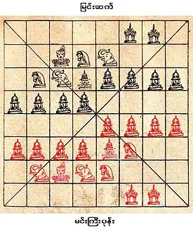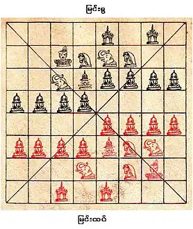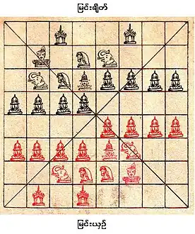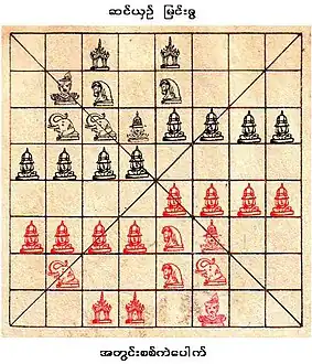 Sittuyin (Burmese: စစ်တုရင်), also known as Burmese chess, is a strategy board game created in Myanmar. It is a direct offspring of the Indian game of chaturanga, which arrived in Myanmar in the 8th century thus it is part of the same family of games such as chess, and shogi. Sit is the modern Burmese word for "army" or "war"; the word sittuyin can be translated as "representation of the four characteristics of army"chariot, elephant, cavalry and infantry.