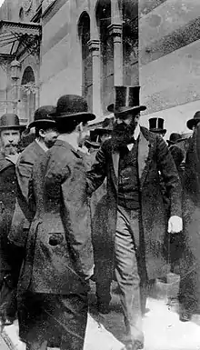 Amongst those supporting the Uganda Scheme was Israel Zangwill who feared a colony in Palestine would lead to an Orthodox revival “precluding modernity”. “We could not [...] lead a modern life there.”[26][27] Another supporter was Eliezer Ben Yehuda who was one of the few delegates with actual experience of living in Palestine.[28] Paradoxically both the reformist Hamizrachi and the ultra orthodox Mizrachi delegates tended to support the plan. Chaim Weizmann, one of the most outspoken of the new generation of Zionists, gave a “violent speech” against, whereas his father and brother, who were also delegates, were in favour. Martin Buber was one of the minority of Western European Jews who vote against. Nachman Syrkin gave a speech criticising Herzl. The delegate from Kishnev as well as the entire Russian leadership voted against. The artist Ephraim Moses Lilien and 23 year old Vladimir Jabotinsky were also against.[29][30][26]