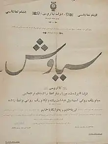 Siyavush[1] (Azerbaijani: Səyavuş) is a legendary-historic play,[2] a tragedy in five acts written by Huseyn Javid, an Azerbaijani poet and playwright in 1932-1933. It is based on motifs[1] of an ancient story from “Shahnameh” poem by Ferdowsi, to the 1000th anniversary of the poet.[3] In 1934, the play was published[2] and then staged by Ismayil Hidayetzade.[3]
