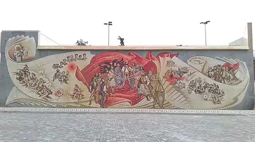 An equestrian statue of Skanderbeg, a medieval Albanian Ruler who fought against Ottoman forces, is located within Skanderbeg Square and symbolically serves to delineate the space for ethnic Albanians.[5] The bronze statue is seven meters high with Skanderbeg depicted with a deep gaze sitting upright on a horse with his right hand raised and sword placed in its sheath.[6] The Skanderbeg statue of Skopje shares a similar socialist aesthetic and equestrian posture with minor differences in detail to existing Skanderbeg monuments in Tirana, Prishtina and other places in Europe.[7] Albanians use Skanderbeg Square to organise large gatherings that celebrate sporting or cultural and political events such as dates significant to the present and past of the Albanians.[5][8]