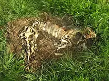 Skeletonization is the state of a dead organism after undergoing decomposition.[1] Skeletonization refers to the final stage of decomposition, during which the last vestiges of the soft tissues of a corpse or carcass have decayed or dried to the point that the skeleton is exposed. By the end of the skeletonization process, all soft tissue will have been eliminated, leaving only disarticulated bones.[2]