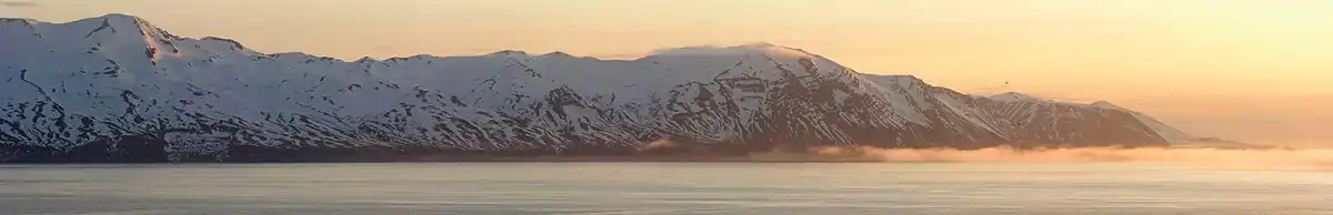 The only town in Skjálfandi Bay is Húsavík, facing the snow-covered Víknafjöll [ˈvihknaˌfjœtl̥] and Kinnarfjöll [ˈcɪnːarˌfjœtl̥] mountain ranges on the other side of the bay. The highest point reaches around 1,200 metres (3,900 ft).