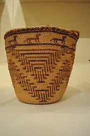 Skokomish twined basket of red cedar bark, bear grass, cattail leaf, ca. 1890