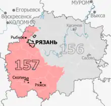 | Districts | Alexandro-Nevsky, Korablinsky, Mikhaylovsky, Miloslavsky, Pronsky, Ryazan (Oktyabrsky, Zheleznodorozhny), Ryazansky (Iskrovskoye, Okskoye, Podvyazyevskoye, Rovnovskoye, Semyonovskoye, Turlatovskoye, Tyushevskoye, Vyshetravinskoye, Vysokovskoye, Yekimovskoye), Ryazhsky, Sapozhkovsky, Skopin, Skopinsky, Starozhilovsky, Ukholovsky, Zakharovsky |