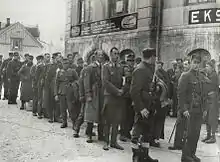 The prisoners were guarded by 80 Norwegian soldiers, 45 of whom belonged to the Varanger Battalion from eastern Finnmark while the remaining 35 were troops that had escaped the collapse of the fighting in the southern parts of Norway and made their way to Northern Norway by way of neutral Sweden.[14] Command of the camp had been transferred to Captain Rei Sandberg by the commander of the Norwegian armed forces in Finnmark, Edvard Os, after disturbances had broken out in the inmate population.[15] During the camp's existence two prisoners died. One merchant navy sailor was killed by a stray warning shot during a disturbance in the camp, and Oberleutnant Hans Hattenbach (the pilot of Oberleutnant zur See Bärner's He 115) was shot on 6 June by a Finnish volunteer soldier when he approached the camp fence and failed to heed orders from a guard to stop. Hattenbach was buried with full military honours in the presence of 30 prisoners and a 14-strong Norwegian military honour guard.[13][16][17]