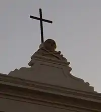 Today, an example of a real skull and crossbones may be seen in the 1732 Nuestra Señora del Pilar church overlooking the famous Recoleta Cemetery in Buenos Aires, Argentina. It contains several altars rescued from other early Spanish churches in South America. One of these has twenty rectangular window boxes arrayed behind and above the altar, five wide by four tall. The size of these glass window boxes is such that the femurs of the priests thus interred are a bit too long to lie flat and so must be leaned up in an "X" formation. The other bones fill in the spaces around the femurs with the skull sitting prominently on top of the bone pile centered above the "X".