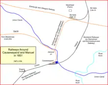 The Slamannan Railway had operated trains to Causewayend, and there seems to have been no proper station there, but probably simply a place near the canal wharf where passengers boarded and alighted. The line to Bo'ness diverged just before the wharf area, at Causewayend Junction, and a new Causewayend station was provided on the line, to the east of the Union Canal.