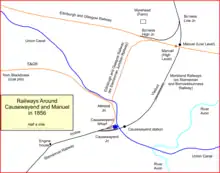 Carter[2] says that there were two branches to connect to the E&GR line, aggregating to 1¼ miles, but he was probably including the separate Slamannan Junction Railway, which built a south-to-east spur from the Slamannan Railway to Manuel on the E&GR. That railway got its Act of Parliament on 4 July 1844 and opened in August 1847.